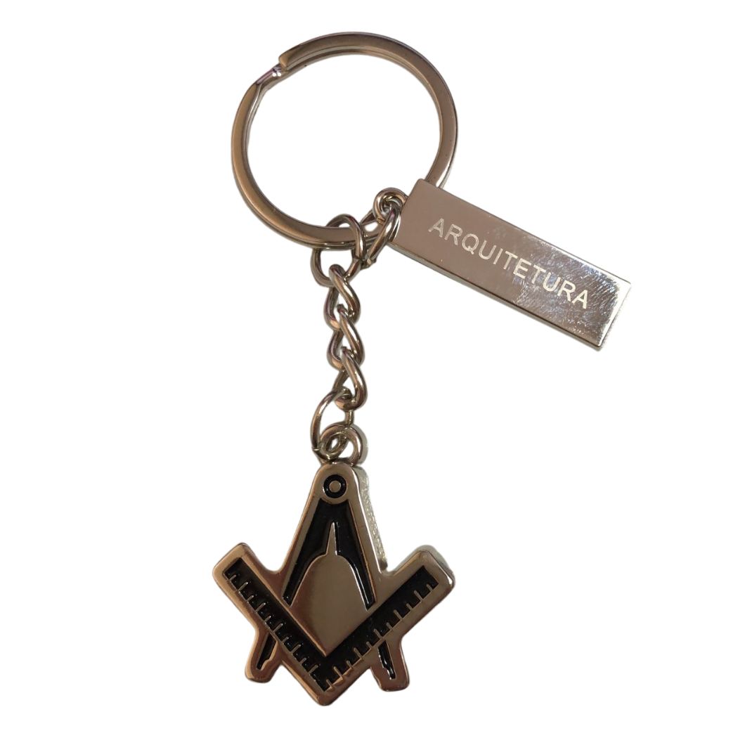 Chaveiro de metal com aproximadamente 10cm de comprimento com o símbolo da profissão arquitetura. Além do símbolo o chaveiro contém uma plaquinha metálica escrita ARQUITETURA e no verso dela gravamos com o nome à sua escolha!
